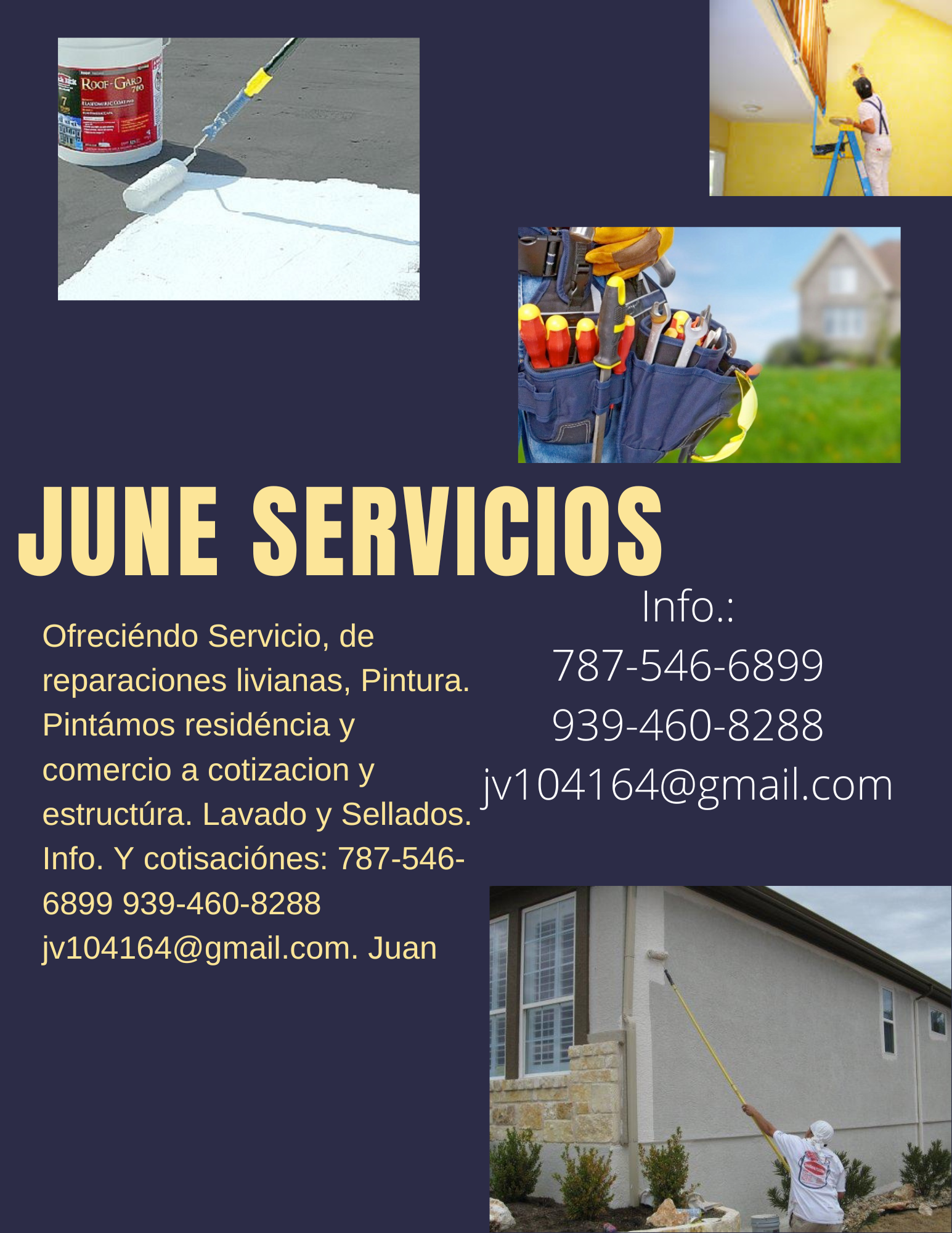 Ofreciendo Servicio de Reparaciones, Instalaciones Livianas. Pintura, Pintamos residencia y comercio a cotizacion y Estructura. Lavado y sellados. Info y cotizaciones: 787-546-6899 939-460-8288 jv104164@gmaill.com. Juan
